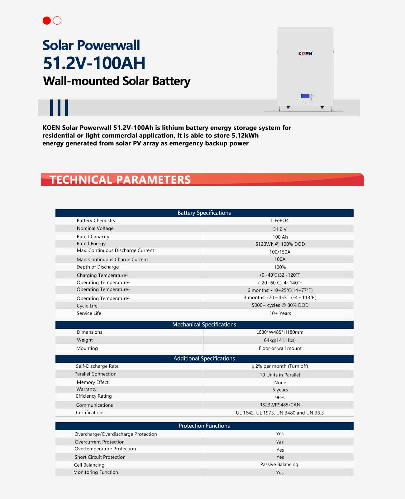 Batterie KOEN Solar Powerwall, utilisant la technologie de batterie au lithium fer phosphate (LiFePO4 ou LFP) comme base, elle présente des caractéristiques non toxiques, sûres, de longue durée de vie, sans entretien, légères de petite taille, de décharge et de taux de charge élevés pour la cellule LiFePO4.